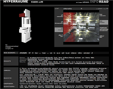 Ziel des Kurses war die Studenten im Umgang mit digitalen Medien und dem Einsatz von Farben und Licht in der Darstellung dreidimensionalen Raumes zu schulen. Ein weiterer Aspekt war Geschichten mittels der Verlinkung von gerenderten Ansichten der Räme zu erzählen. Sämtliche Übungsergebnisse der Studierenden sind sofort im Internet sichtbar gewesen und konnten daraufhin von den anderen Studierenden in die eigenen Geschichten eingebaut werden. Die gesamte Kursumgebung wurde in PHP3 programmiert und generiert sich aus Daten, welche in einer MySQL-Datenbank abgelegt sind. Am Kurs haben 170 Studenten während zweier Semester teilgenommen und wurden von 12 Assistierenden betreut. Auch die Assistierenden kommunizierten und protokollierten die Ergebnisse der studentischen Arbeit innerhalb der Kursumgebung, so dass auch der Workflow zwischen den Mitgliedern des Lehrkörpers komplett ins Internet verlagert werden konnte. Der Kurs wurde Sommer 1999 von Herrn Kai Strehlke weitergeführt.