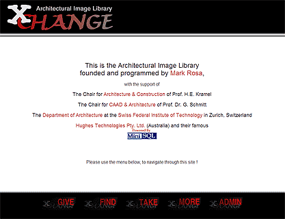 Ziel des Projektes ist es eine webbasierte Architekturbild-Datenbank aufzubauen, welche dem Open Source Prinzip verpflichtet ist und es den Interessenten ermöglicht Bilder von architektonischen Objekten mittels Stichwort und Kategorie zu finden und die Daten für nichtkommerzielle Publikationen frei zu verwenden. Das besondere an diesem Projekt ist für den damaligen Zeitpunkt die umfangreiche Datenbankanbindung, die sehr gezielte Suchen ermöglicht, aber auch Themenbezogene Auswahlen von Bildern, zum Beispiel Projekte von Schulbauten, die in Holz ausgeführt wurden, bieten kann. XChange wurde in PERL programmiert und nutzt eine MiniSQL Datenbank.